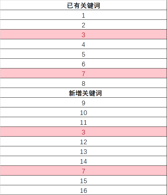 这个方法管理词库相对来说,简单些。举个例子,假如词库中“已有关键词”有10W个,我们列出8个关键词(用1、2、3、4、……8数学代替)用来示意问题。而现在需要新增加100W个“新增关键词”(用表格中对应的数字示意)。此时,到重点了: