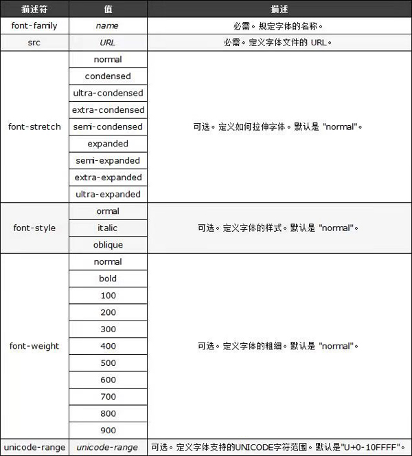 下面的表格列出了能够在@font-face 规则中定义的所有字体描述符: